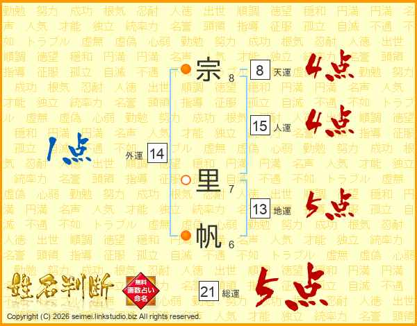 宗里帆さんの総運は21画の5点!