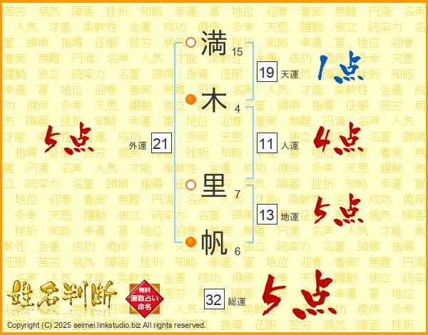 生活面を象徴する運勢です。外部から受ける影響力を表し、結婚運、家庭運や職場、環境への順応性を表します。総運から人運を引いた画数。姓や名が1文字の場合を除く。