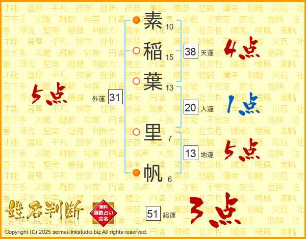 素(10画)稲(15画)葉(13画) 里(7画)帆(6画)