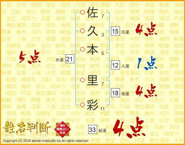佐(7画)久(3画)本(5画) 里(7画)彩(11画)