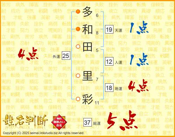 多(6画)和(8画)田(5画) 里(7画)彩(11画)