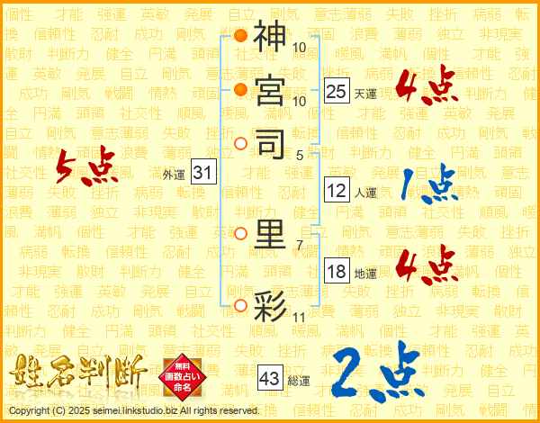 神(10画)宮(10画)司(5画) 里(7画)彩(11画)