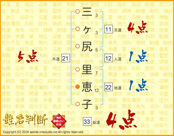 三(3画)ヶ(3画)尻(5画) 里(7画)恵(12画)子(3画)