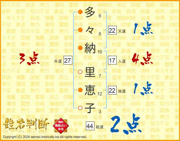 多々納里恵子さんの総運は44画の2点!