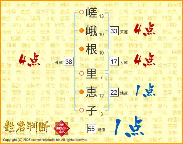嵯(13画)峨(10画)根(10画) 里(7画)恵(12画)子(3画)