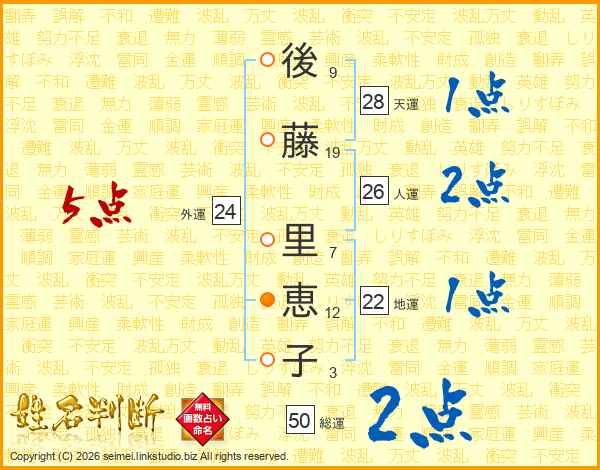 後(9画)藤(19画) 里(7画)恵(12画)子(3画)