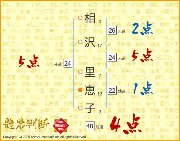 相(9画)沢(17画) 里(7画)恵(12画)子(3画)