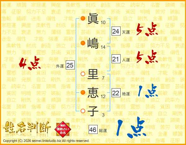 眞(10画)嶋(14画) 里(7画)恵(12画)子(3画)