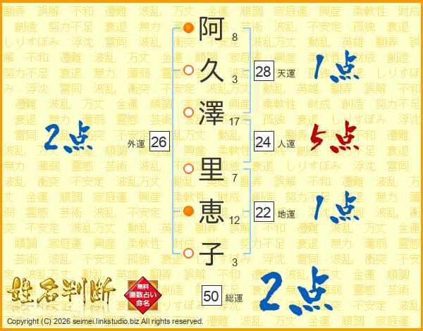 阿(8画)久(3画)澤(17画) 里(7画)恵(12画)子(3画)