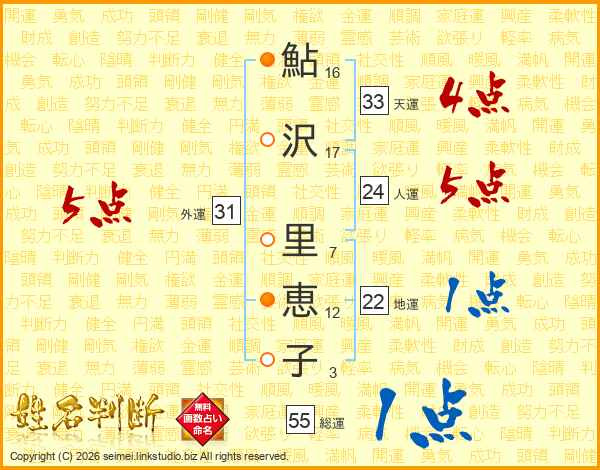 鮎沢里恵子さんの総運は55画の1点!