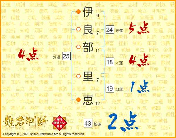 伊(6画)良(7画)部(11画) 里(7画)恵(12画)