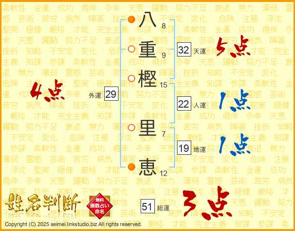 八(8画)重(9画)樫(15画) 里(7画)恵(12画)