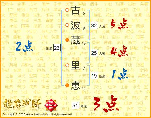 古(5画)波(9画)蔵(18画) 里(7画)恵(12画)