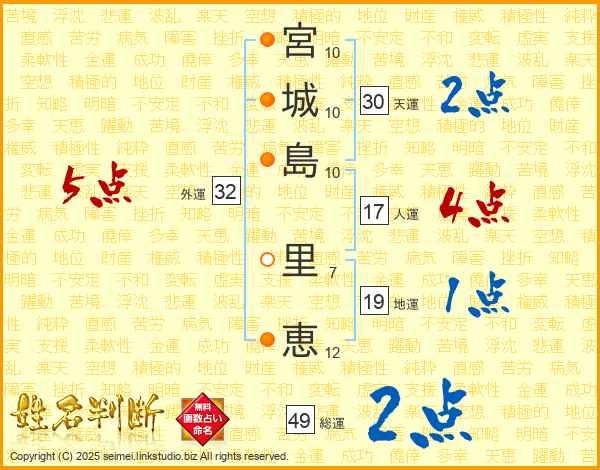 宮(10画)城(10画)島(10画) 里(7画)恵(12画)