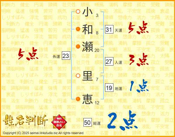 小(3画)和(8画)瀬(20画) 里(7画)恵(12画)