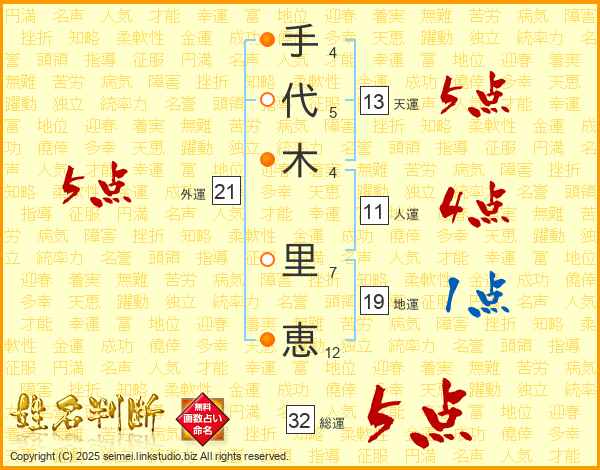 手(4画)代(5画)木(4画) 里(7画)恵(12画)
