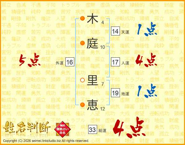 生活面を象徴する運勢です。外部から受ける影響力を表し、結婚運、家庭運や職場、環境への順応性を表します。総運から人運を引いた画数。姓や名が1文字の場合を除く。