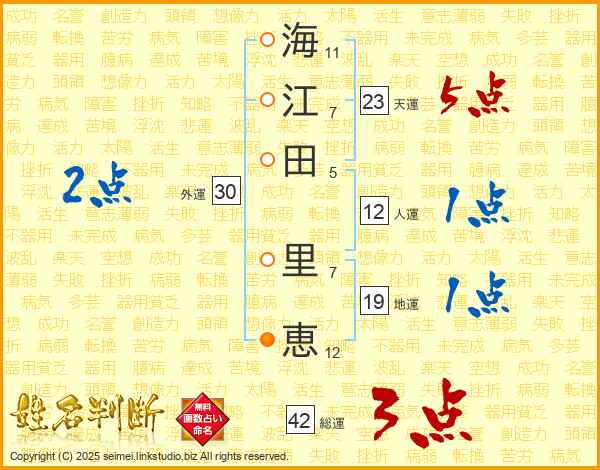 海(11画)江(7画)田(5画) 里(7画)恵(12画)