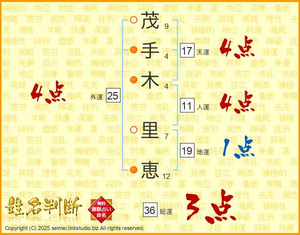 茂(9画)手(4画)木(4画) 里(7画)恵(12画)