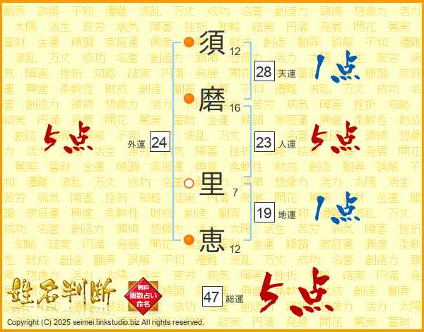 生活面を象徴する運勢です。外部から受ける影響力を表し、結婚運、家庭運や職場、環境への順応性を表します。総運から人運を引いた画数。姓や名が1文字の場合を除く。