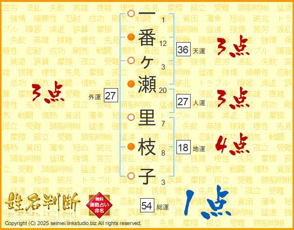 一番ヶ瀬里枝子さんの外運は27画の3点!
