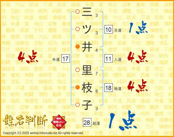三(3画)ツ(3画)井(4画) 里(7画)枝(8画)子(3画)