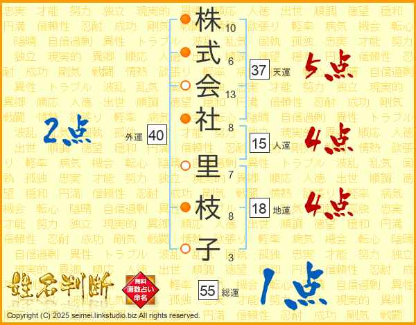 株(10画)式(6画)会(13画)社(8画) 里(7画)枝(8画)子(3画)