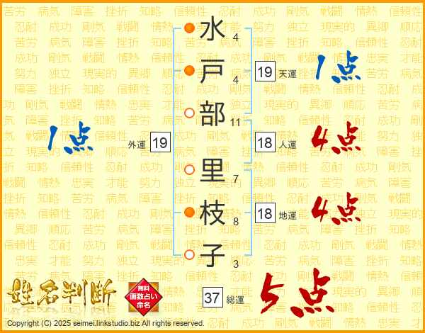 水(4画)戸(4画)部(11画) 里(7画)枝(8画)子(3画)