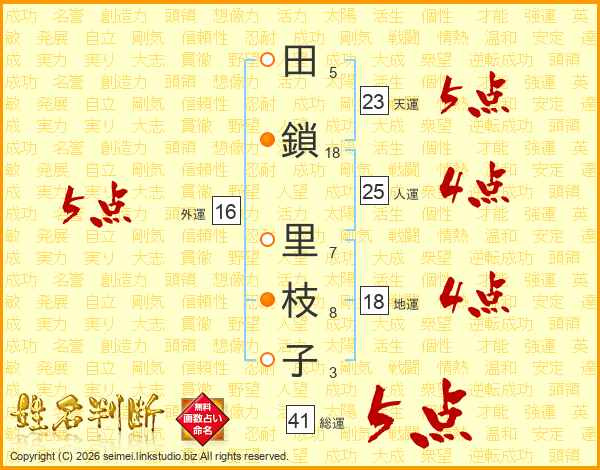 田(5画)鎖(18画) 里(7画)枝(8画)子(3画)