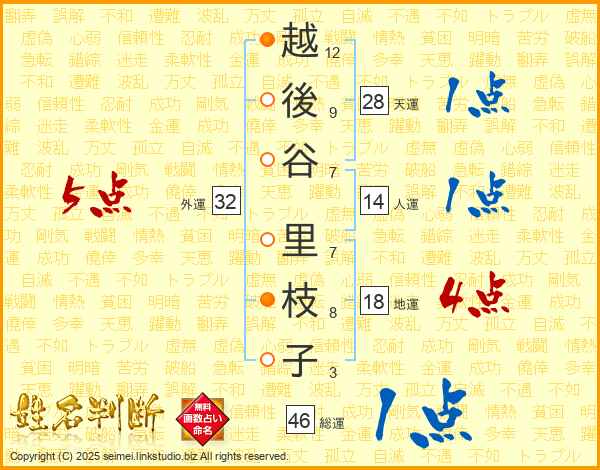 越(12画)後(9画)谷(7画) 里(7画)枝(8画)子(3画)