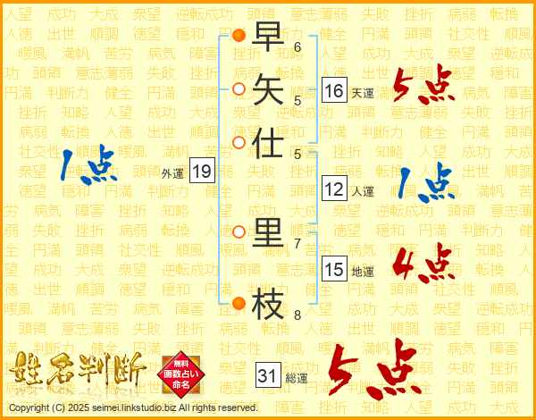 生活面を象徴する運勢です。外部から受ける影響力を表し、結婚運、家庭運や職場、環境への順応性を表します。総運から人運を引いた画数。姓や名が1文字の場合を除く。