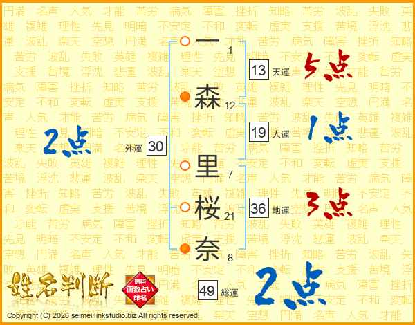 一(1画)森(12画) 里(7画)桜(21画)奈(8画)