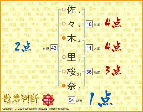 佐(7画)々(7画)木(4画) 里(7画)桜(21画)奈(8画)