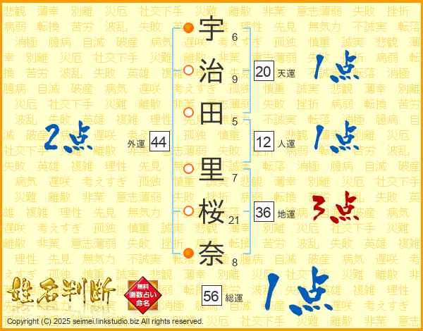 宇(6画)治(9画)田(5画) 里(7画)桜(21画)奈(8画)