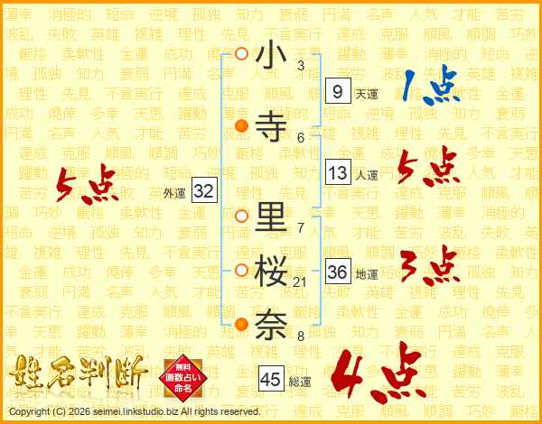 小(3画)寺(6画) 里(7画)桜(21画)奈(8画)