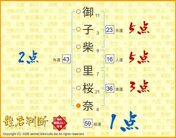 御(11画)子(3画)柴(9画) 里(7画)桜(21画)奈(8画)