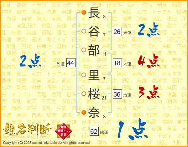 長(8画)谷(7画)部(11画) 里(7画)桜(21画)奈(8画)