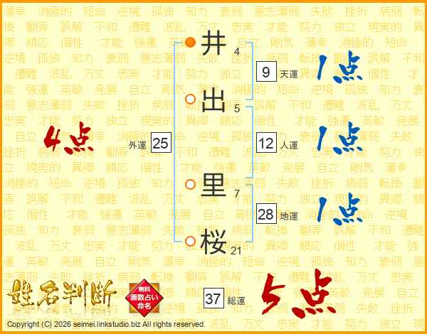 井(4画)出(5画) 里(7画)桜(21画)