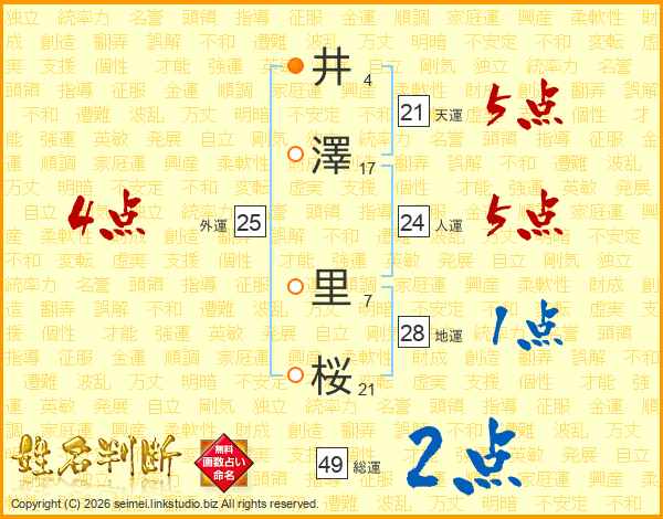 生活面を象徴する運勢です。外部から受ける影響力を表し、結婚運、家庭運や職場、環境への順応性を表します。総運から人運を引いた画数。姓や名が1文字の場合を除く。