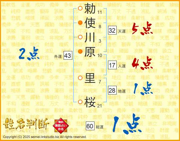 勅(11画)使(8画)川(3画)原(10画) 里(7画)桜(21画)