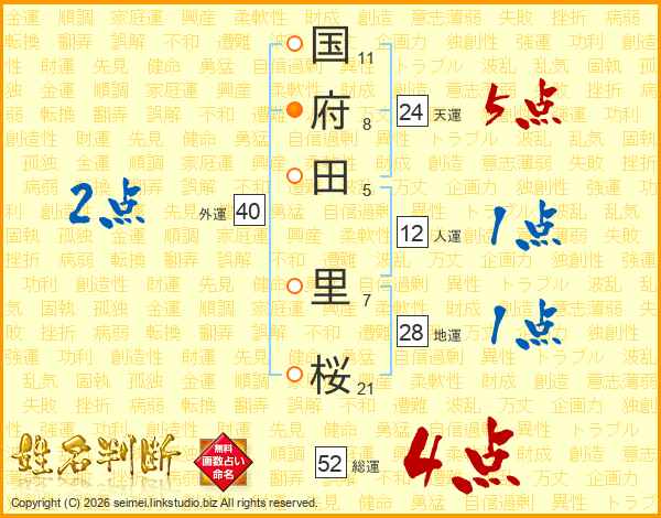 国府田里桜さんの総運は52画の4点!