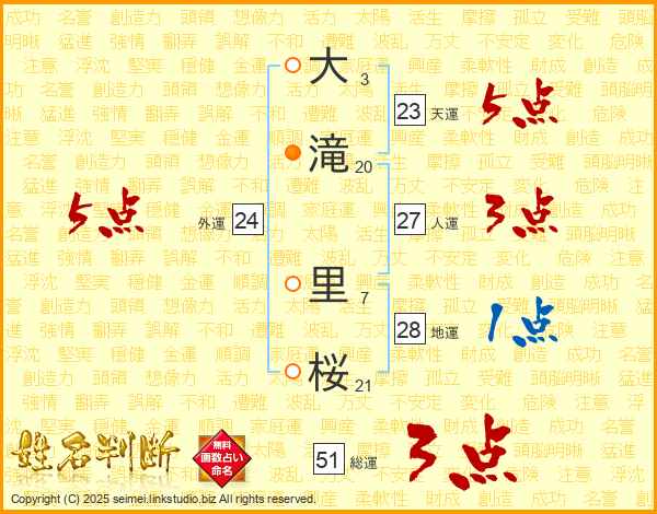 生活面を象徴する運勢です。外部から受ける影響力を表し、結婚運、家庭運や職場、環境への順応性を表します。総運から人運を引いた画数。姓や名が1文字の場合を除く。