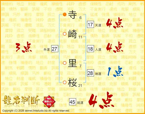 寺崎里桜さんの総運は45画の4点!