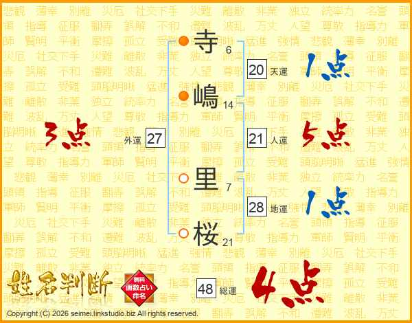 寺(6画)嶋(14画) 里(7画)桜(21画)