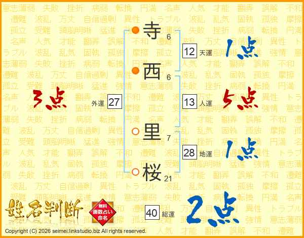 寺西里桜さんの人運は13画の5点!