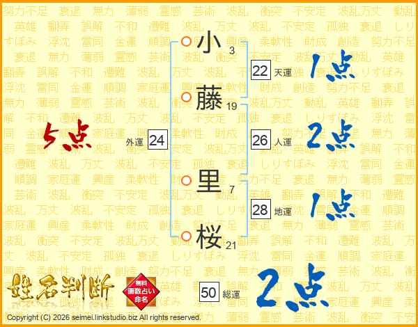 生活面を象徴する運勢です。外部から受ける影響力を表し、結婚運、家庭運や職場、環境への順応性を表します。総運から人運を引いた画数。姓や名が1文字の場合を除く。