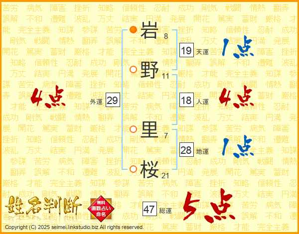 あなたの人生を表す1番重要な運勢です。生涯を通じて影響する総合運となり、主に50歳以降の晩年期に影響を及ぼします。苗字と名前の合計画数。