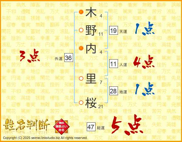 木(4画)野(11画)内(4画) 里(7画)桜(21画)