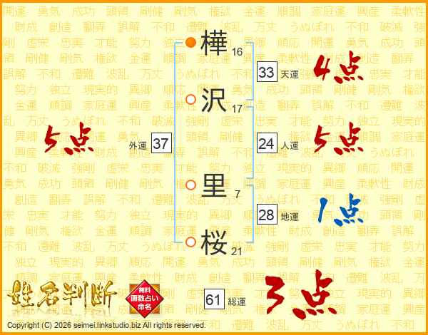 樺沢里桜さんの外運は37画の5点!