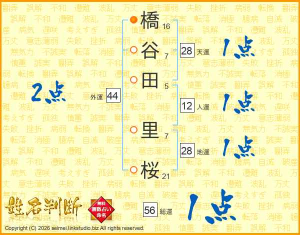 橋(16画)谷(7画)田(5画) 里(7画)桜(21画)